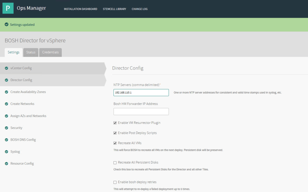 At this point I have a functioning Ops Manager and my BOSH Director is now deployed. In my next article I will be looking at prepping NSX-T for deploying PKS.