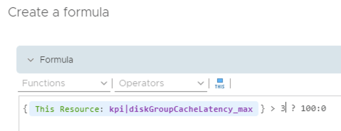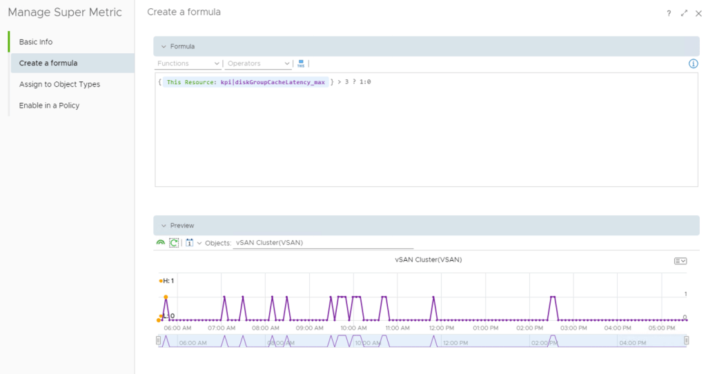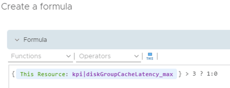 To create the Super Metric for my scenario I need to define a condition within the metric together with what t do if this condition is or is not met. Here my metric formula says that if the read cache write buffer latency is greater than 3 then set the Super Metric value to 1, otherwise set it to 0.