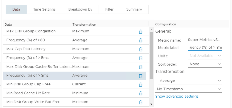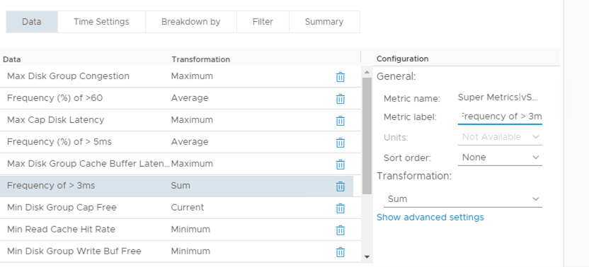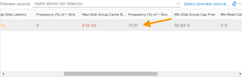 Charts are great for showing you metric data as it is occurring and providing a graphical history of what has occurred. What they are not very good at is giving you precise quantitative information. For example, for my vSAN cluster I would like to know how often the ‘KPI Max Disk Group Read Cache/Write Buffer Latency” metric is above 3ms. Here’s a basic metric chart on a custom dashboard with some threshold lines added which gives me a rough idea but not the hard numbers.