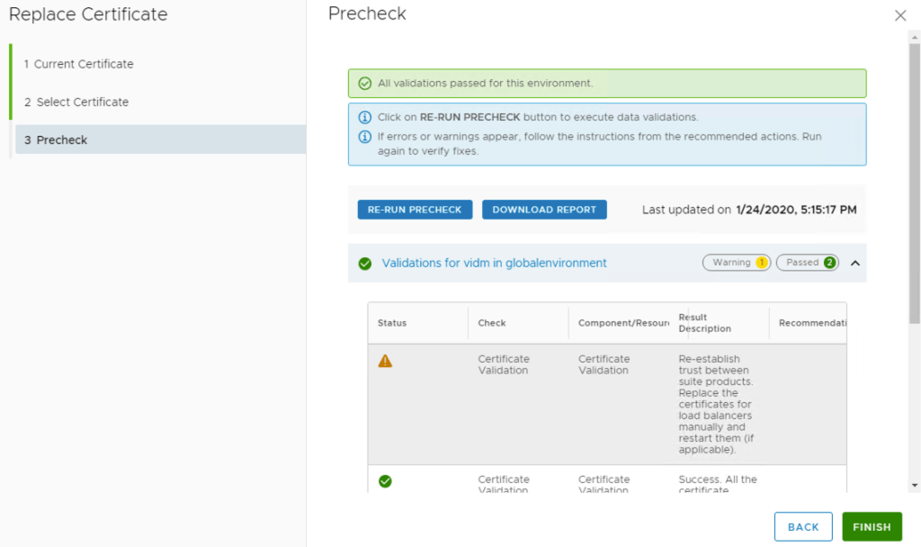 The operation pre-checks give a gentle reminder that if you replace the SSL certificate you will need to re-establish trust between vIDM and any products already deployed that connect to vIDM over SSL.
