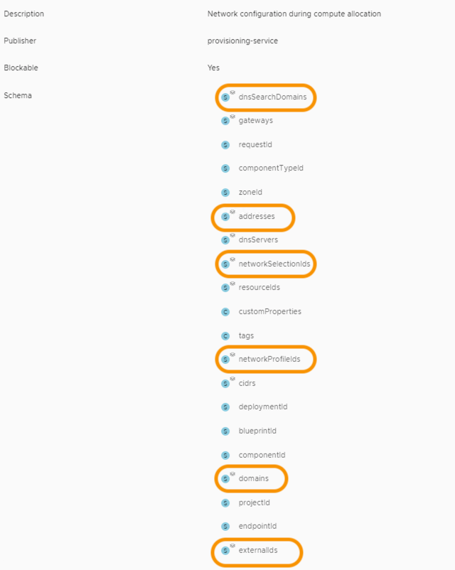 The next step is to examine what data vRA is going to provide me. I need to make sure I am going have all the information I need to request IP addresses from the right network and have other data I need such as hostnames used to register DNS records etc. The best place to start is the schema of the event topic. I have circled a number of items in the schema that might prove useful to my workflow.