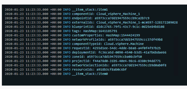 A good starting point is to log everything in a simple workflow that cycles through each payload property and logs all values. In this example my workflow is taking an input properties object called “inputProperties” which is populated when vRA triggers the workflow.