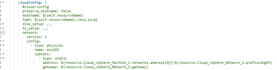 Now that the template has been amended we can turn our attention to the blueprint in Cloud Assembly. Specifically, the cloudConfig section needs to be amended.