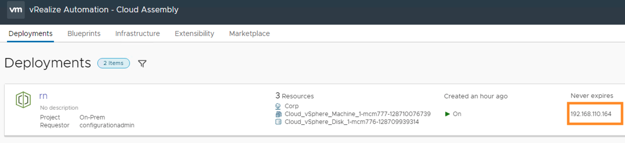The IP address and gateway details match across the IP range covered by the network, the address shown in the deployments view and the details visible within the guest OS. Note that my DHCP range on this network is 192.168.110.220-240).