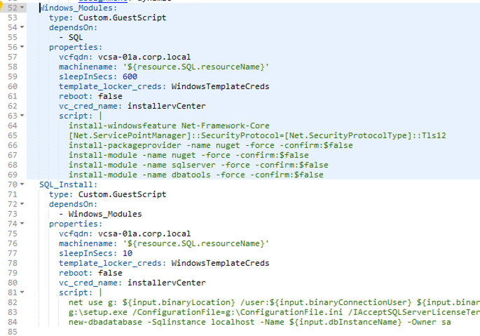 My first script component installs all the Windows prerequisites including PowerShell modules that will enable me to control SQL once it has been installed. The second script component is responsible for running an unattended SQL installation over the network from an SMB share (where both the SQL binaries and the unattended install file are located) as well as creating a default database using the PowerShell module installed previously.