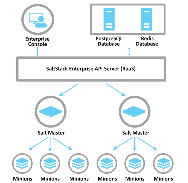 The Enterprise or Config stack is where things start getting interesting (not that they weren’t before!). Again this diagram is taken from the SaltStack documentation. SaltStack Enterprise/Config adds the top layer to the Open Source solution so far. You will often here this referred to as “RaaS” (Returner as a Service) but that is only one component of SaltStack Enterprise/Config. Essentially the Enterprise/Config stack provides the console GUI and centralized job management interface, a centralized file server backed by PostgreSQL, an in-memory database provided by Redis and the Enterprise API. This is not the same API as on the Master!