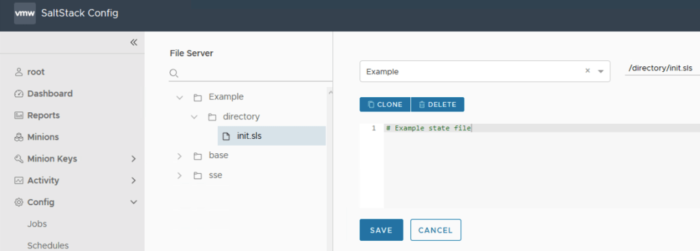 The following is a basic example using the in-built file server in SaltStack Config which has 3 environments defined (Example, base and sse). Within the Example environment there is one directory and one state file within that.