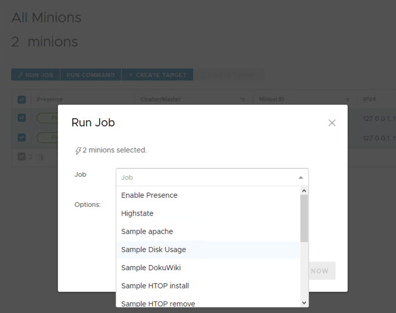 Once the job is defined it can then either be run directly from the Job screen after choosing a target or by selecting the target Minions from the Minions menu and then choosing the Job to run.