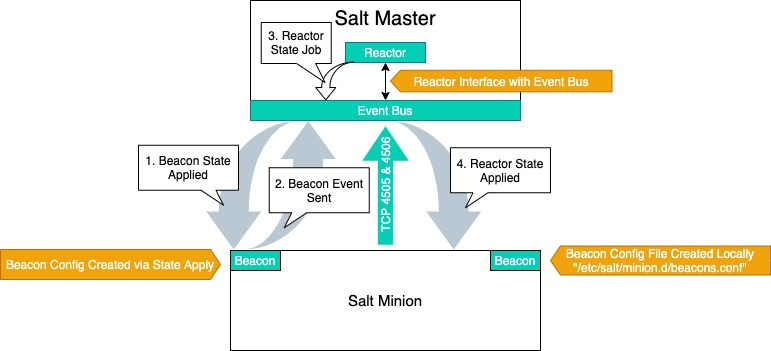- Salt Beacon places an event on the Event Bus of the Master when an event happens that matches the Beacon config