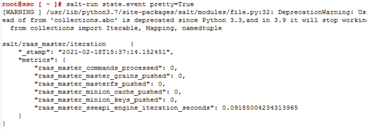 So the configuration is good but I need to know whether the Beacon event will be received by the Master and how the event payload will look so I can start planning what I want a Reactor to do and what information it will have available. To do this I am going to start the salt event runner on the command line of my Master and then stop my crond service on my Minion to see what happens.